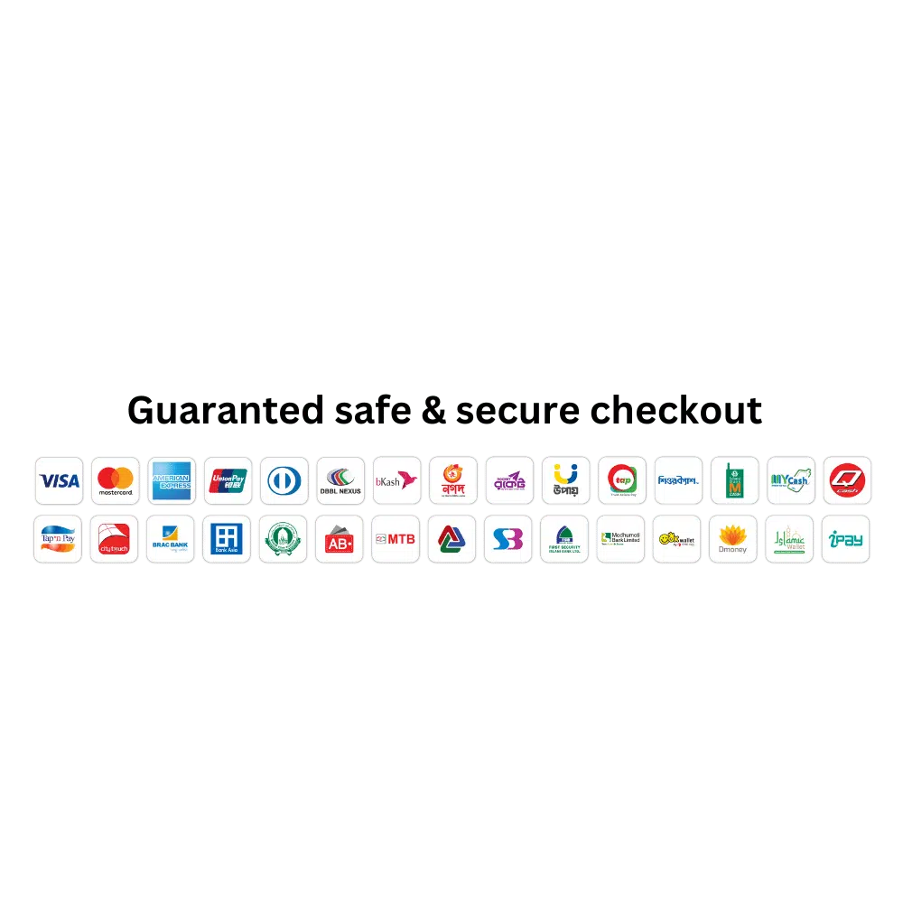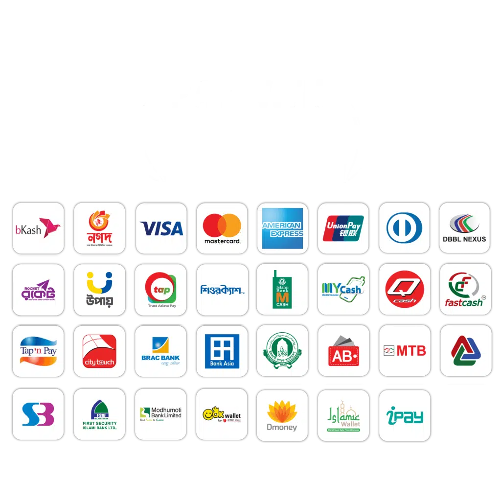 আমাদের বিকাশ, নগদ এবং বাংলাদেশের রেপুটেড এসএসএলকমার্সের পেমেন্ট গেটওয়ে রয়েছে সুতরাং কার্ড,মোবাইল ব্যাংকিং ও নেট ব্যাংকিং যেকোনো চ্যানেলের মাধ্যমে আপনি পেমেন্ট করতে পারবেন এবং আপনার পেমেন্টটি সম্পুর্ন সিকিউর থাকবে।
